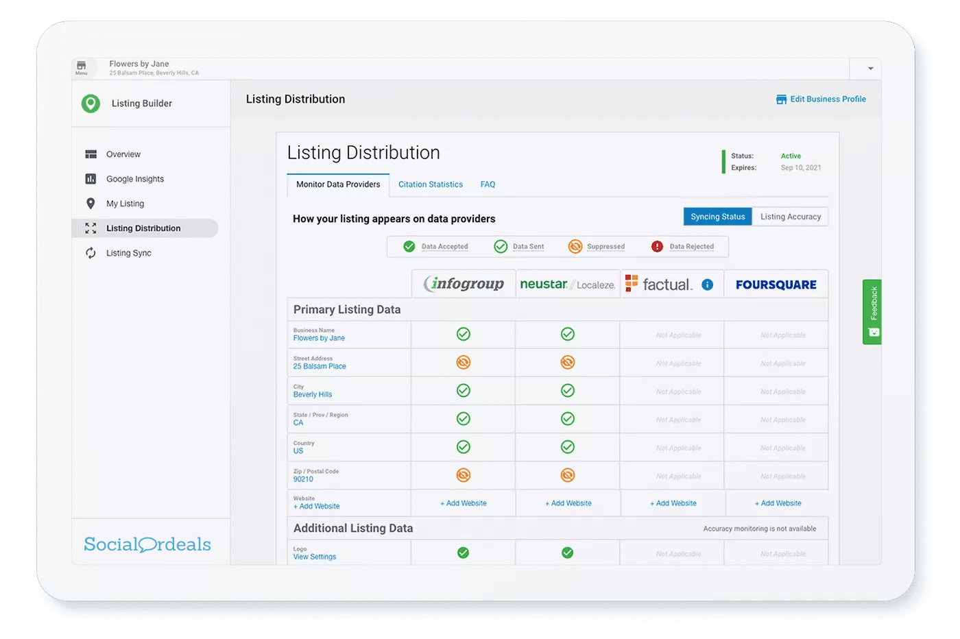 Listing Distribution allows you to build accurate business listings on the four major data aggregators—Factual, Acxiom, Infogroup, and Neustar/Localeze. These aggregators are referenced by over 300 sites. As a result, Listing Distribution helps you: