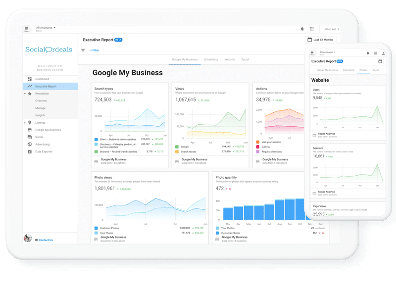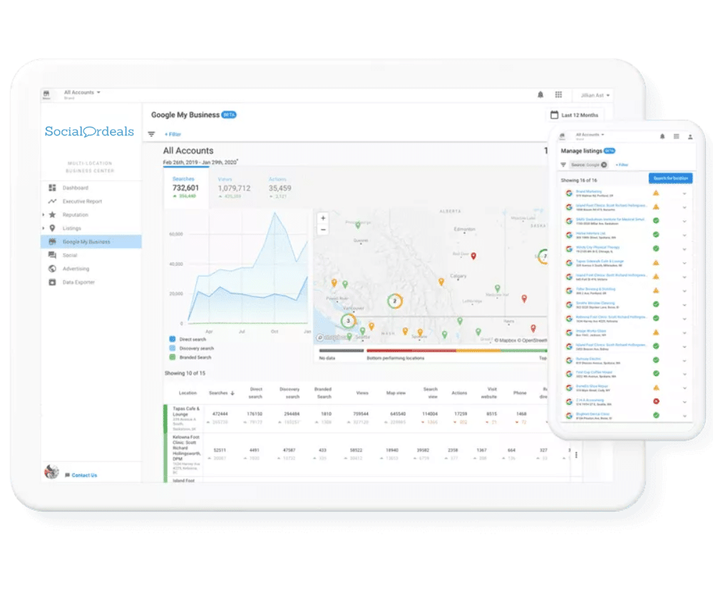 Multi-location supports the ability to oversee thousands of franchise locations. Giving your team the ability to quickly organize important digital marketing metrics so you can easily see how all your locations are doing compared to each individual location.